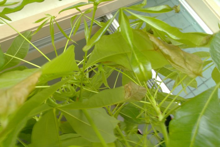 同上一样,如果盆土内缺水,水分不足以维持发财树的生长,就会导致发财树的下部的老叶子出现卷曲甚至是焦枯的现象。所以在养殖发财树的时候,需要保持土壤有一定的湿度,可以的话适当的多喷水来增加环境的湿度。